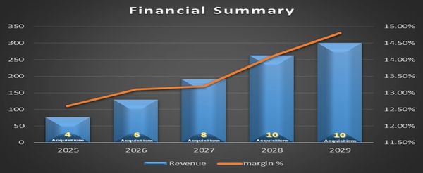 Assume 3 initial acquisitions Q1 2025, followed by 2 new acquisitions each year from 2025 to 2028, reaching a total of 10 acquired companies by 2028.